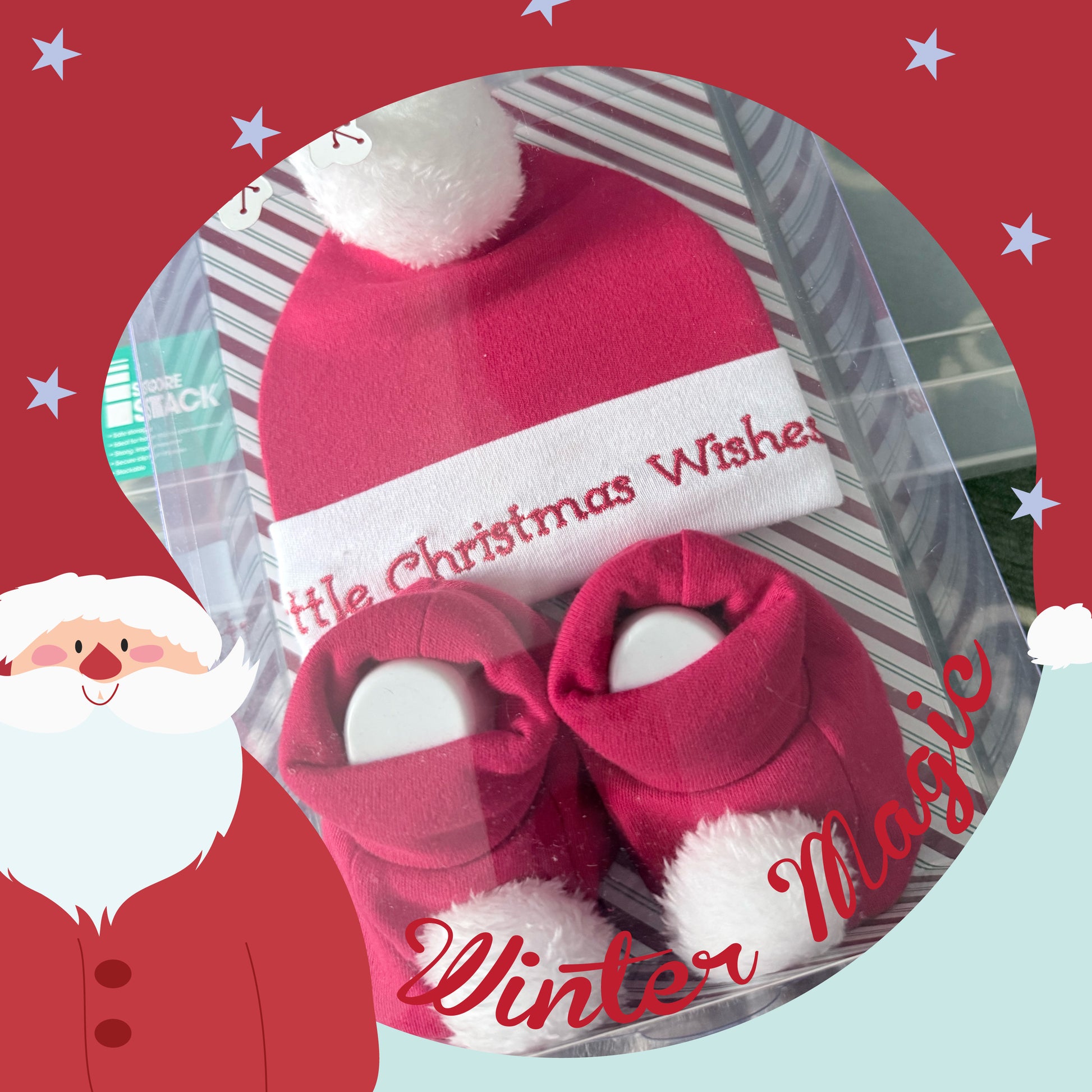 Beautiful little hat & booties set . 0/3 or 3/6 months . Ideal for their first Christmas Eve box . Can be personalised which is included in the cost . £4. 00 each set.