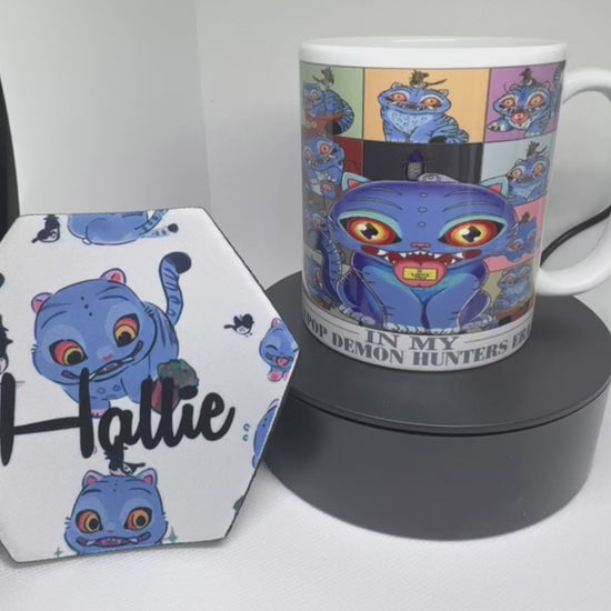 K-pop demon hunters personalised mug set . Comes with pen . Name can be added to all included in the cost . Ideal for Christmas present .